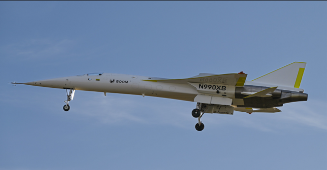 Boom Supersonic’s XB-1 demonstrator seen landing after its March 22, 2024 flight — a major step in the company’s quest for commercial supersonic travel.